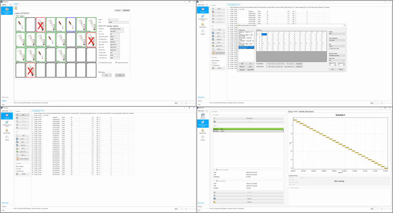 样品处理的灵活性:CHRONECT XPR可容纳三种不同的样品瓶架,每个架子可放置12至96个1-8毫升的样品瓶。该系统能够处理多达32种不同的粉末和6种不同的液体,在配方方面提供了无与伦比的灵活性。
