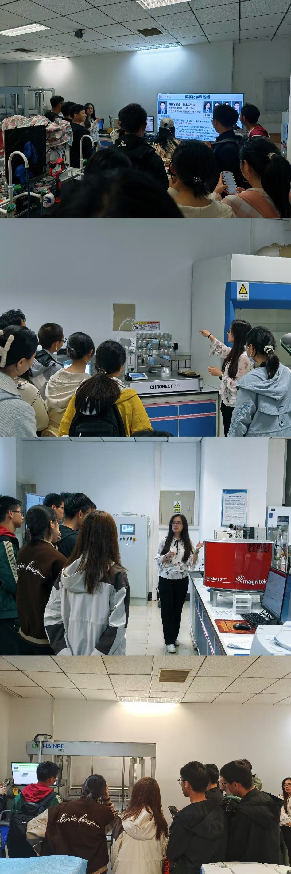 在本次参观活动中,杨文博老师担任了精彩的讲解员。她深入浅出地为同学们介绍了基于数据驱动的智能化学合成平台在分子设计、高通量筛选以及工艺放大等方面所开展的前沿工作。同学们聚精会神地聆听,仿佛置身于科学的奇妙世界中。
