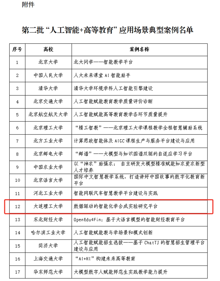 近日,教育部高等教育司公布了“人工智能+高等教育”应用场景典型案例名单,我校推荐的案例“数据驱动的智能化学合成实验研究平台”从全国高校申报的数百项案例中脱颖而出,成功入选32个典型案例之一。