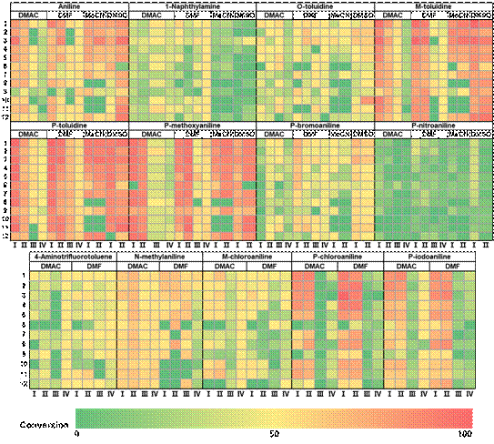 其中,筛选有机胺13种,包括苯胺、萘胺、邻甲苯胺、对甲苯胺、对甲氧基苯胺、对硝基苯胺、4-氨基三氟甲苯、间氯苯胺、对碘苯胺、对氯苯胺、N-甲基苯胺、对溴苯胺、间甲苯胺,筛选偶联试剂4种,包括HBTU、PyBOP、DPP-CI、BOP-CI,筛选羧酸12种,包括乙酸、丙酸、丙烯酸、丁酸、正己酸、乙酰丙酸、苯甲酸、对氯苯甲酸、对甲氧苯甲酸、烟酸、异烟酸、乙酰水杨酸,筛选溶剂4种,包括DMAC、DMF、MeCN、DMSO,一共1632个反应。