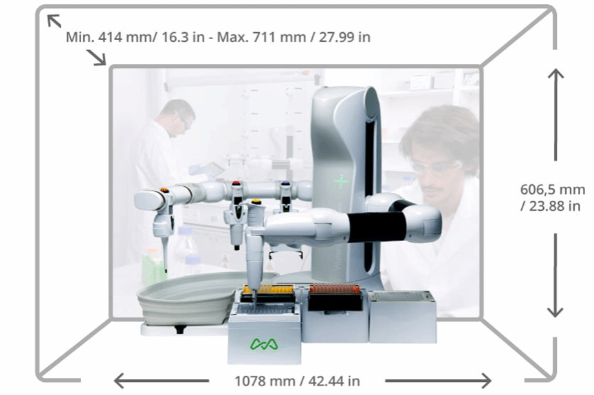 液体处理机器人的设计适合大多数实验室工作台和生物安全柜 (BSC)。Andrew+ 即使装满两排 Dominos(可使用 7 个微孔板或 56 个falcon试管或 168 个微管),也只占约 55 厘米/22 英寸的深度,甚至适合最小的通风橱。液体处理器独特的紧凑尺寸和设计使其可以在 20°C-37°C 的温度下工作。